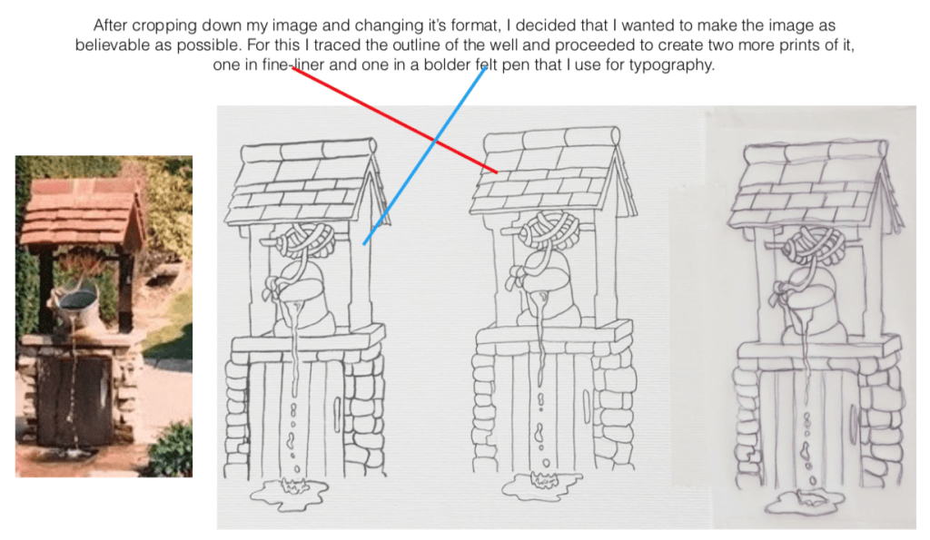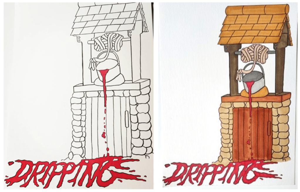 The struggle with this illustration was the decision of whether I should have left the illustration as just lifework and red from the blood or if it looks better coloured like I did for my final design? I like both the images equally as I feel like the first image where I haven’t coloured the well in, makes the ‘dripping’ of the blood really stand out as it is a hot colour but on the other hand I feel like it looks like the image isn’t complete. The second image (my final design) I feel also has strengths and weaknesses. On one hand I feel like the image is complete with colour as it gives the image more depth but on the other hand I also feel like the colours almost cover up the ‘dripping’ part of the illustration as the colour I used for the well door is too much like the red of the blood and the two colours seem to clash.