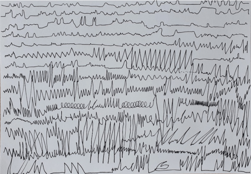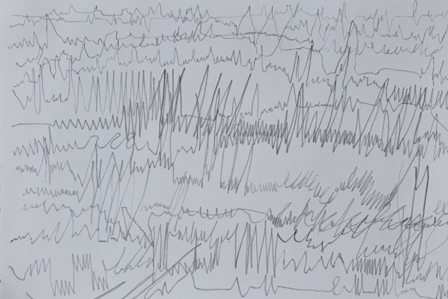 This was my first mark making attempt. For this I used a fine-liner as my tool and white cartridge paper as my material. I started the track and held my pen in the other hand so I could start drawing as soon as it started. I recoded all the fluctuations in the track from the calming start to the explosion of instruments after the first part. On the back of each of my pieces of paper I wrote down how long I played the track for (until I finished the page) and then I stopped. For this piece it took me from 0:00 to 7:11, I also kept my eyes open for this attempt.