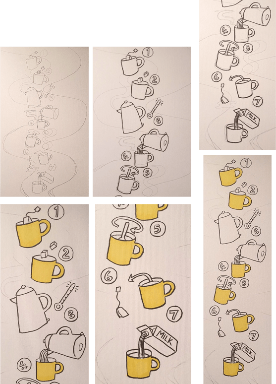 Overall I am happy with the outcome of this design, I tested it out on my mum and grandmother to see if they were able to understand what I was trying to explain through the illustration. They both said that it was easy to understand each part of the process as it ‘flowed’ downwards until you are at the last step which is adding the milk. If anything the tea down the sides of the pages made the illustration seem a lot more childish and more like a badly painted watercolour in comparison with the well illustrated designs in the centre of the image.