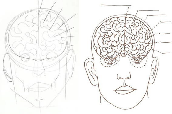 After scaling the image, I draw out a simple human head sketch like I would normally do when drawing someone’s face in still life. After that I added very minimal facial features so you know what you’re looking at. I knew that the main focus for this image was the diagrammatic side of the illustration so I then added the lines for the writing but didn’t actually add any of the type as you wouldn’t write down all the latin words if you were just creating a visual, that’s something you would do right at the end. I added the brain but drew it in a very sketchy way.