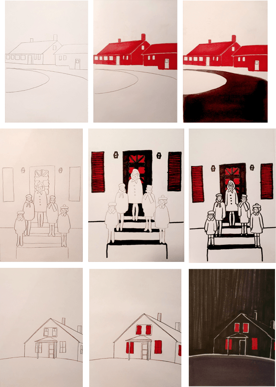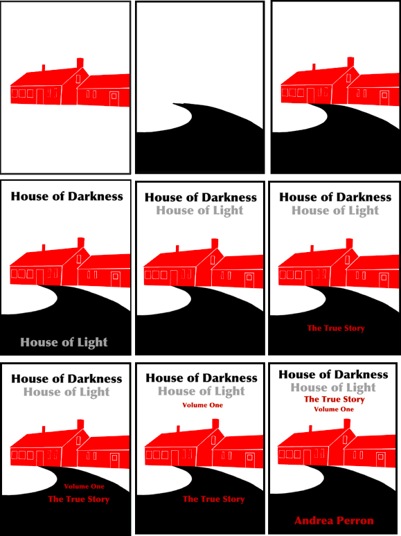 Above are 9 images showing my design process when creating my final image. I decided to base my design off of the real conjuring house photo shown above as i liked the way the path curved out of the image and I thought that I could do something with it. I started off with the farmhouse which I coloured red, I then created the black path running up to the house. (I wanted the colour of the book design to only be in black, red and white as these colours are very bold yet haunting, I wanted the black path to look like a sinister path of ‘darkness’ heading into the ‘bloody house’. I also decided to leave the background white to symbolise the time of year that the Perron family moved into the house (winter, like it is said in the blurb). I also wanted to keep the writing bold and easy to read, like I said in my brief for the cover. I created the typeface so that the ‘house of darkness’ was in black and the ‘house of light’ was in grey (the lightest colour I could use that is still readable). In the images above where I have shown my process, I have also added a few images of where I was thinking of where I could incorporate the type into the image, one of the images shows where I first put ‘house of darkness’ with the write background, and added the ‘house of light’ in the darkness of the path. I liked the way this worked but as I thought of where I should put the other parts of the type on the front cover, the reader could potentially read the cover as “house of darkness, the true story, volume one, Andrea Perron, house of light” and this could potentially confuse some people.