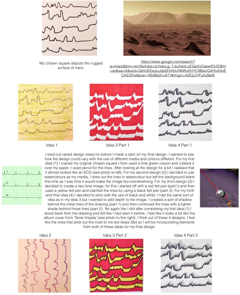 My chosen square from my first attempt. Materials used: fine-liner and cartridge paper. I decided on this particular square as I felt it had depth and communicated the piece of music well as when I am listening to ‘rite of spring’ I like to imagine that it is influenced by the power of space. The instruments used for the piece of music are so strong when you hit the first real powerful part of the track. The piece below reminds me of the rocks on mars.