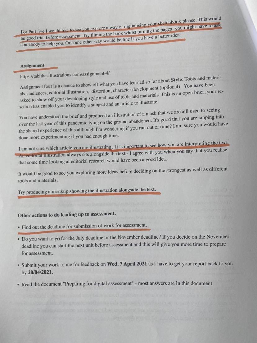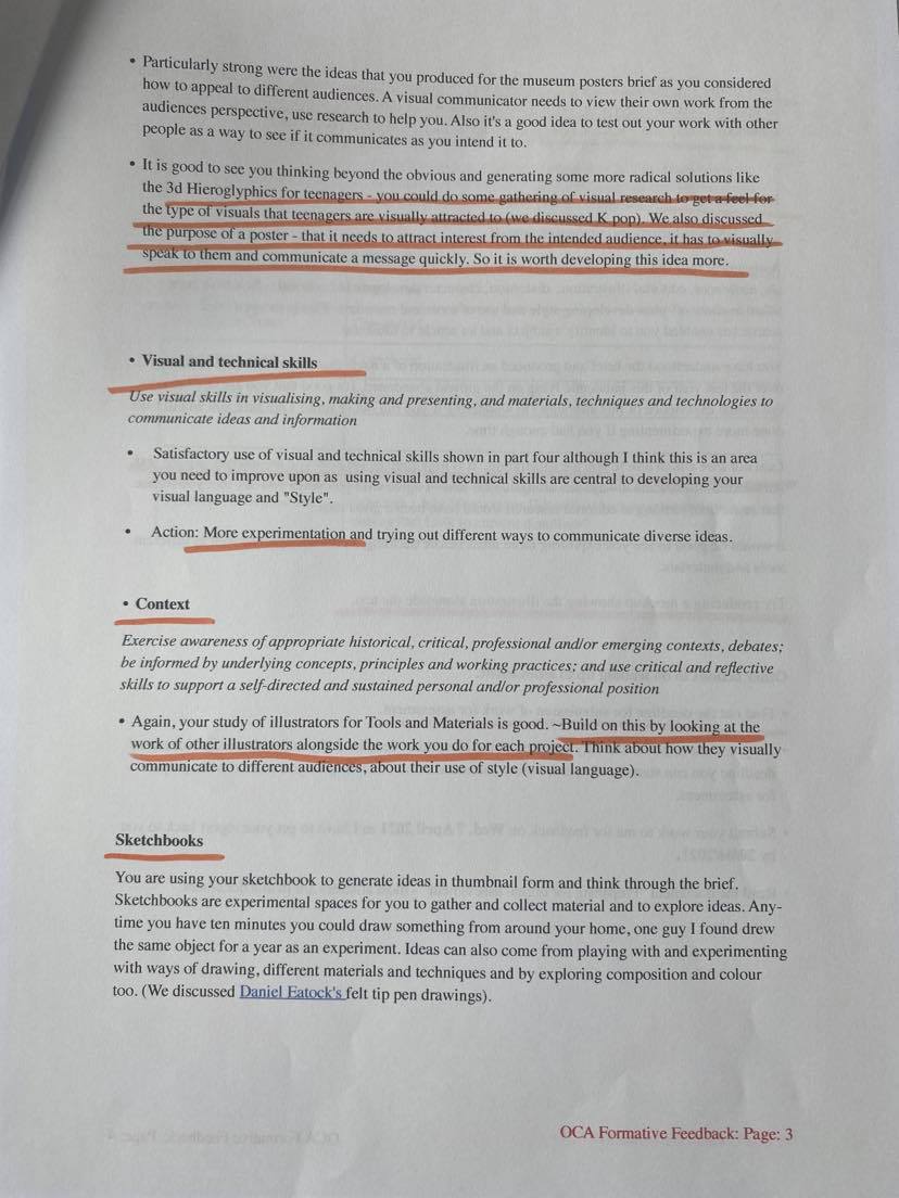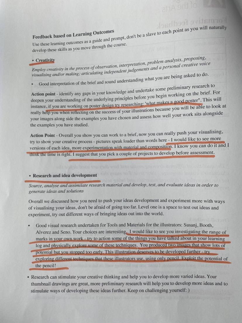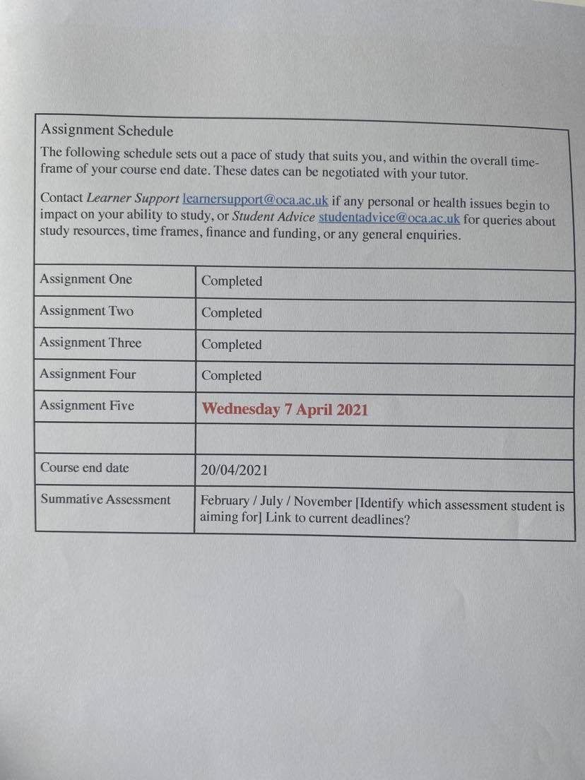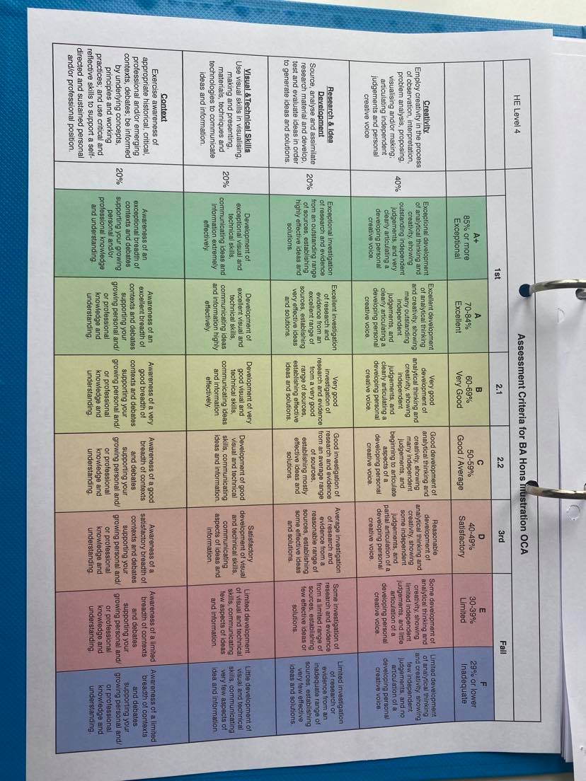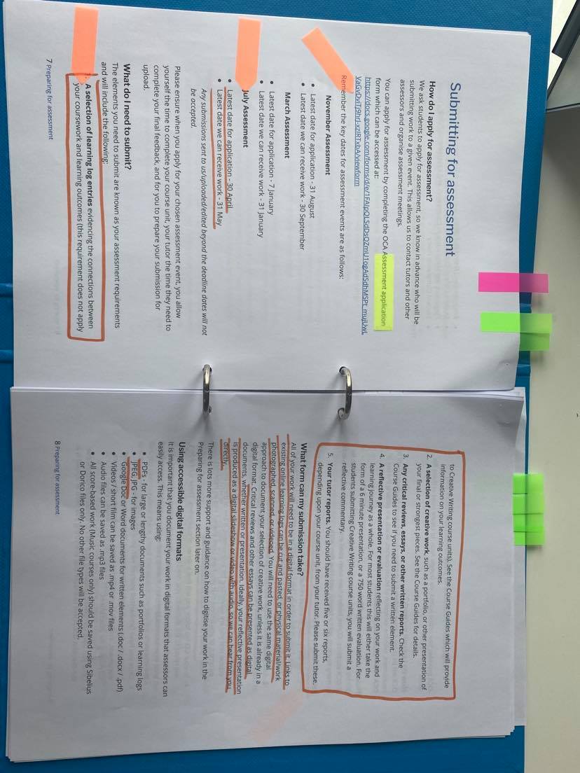 Following on from the chat with my tutor I have read through my formative feedback and highlighted specific points that are very important. Below are photos of my highlighted feedback form. From reading though my tutor feedback I have also printed off a ‘preparing for assessment’ document and the assessment criteria for my course. I re-made the assessment criteria as colours are very important to me and I struggled to understand what was written in the original.