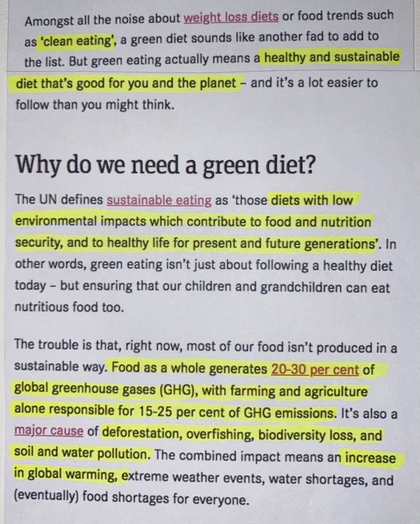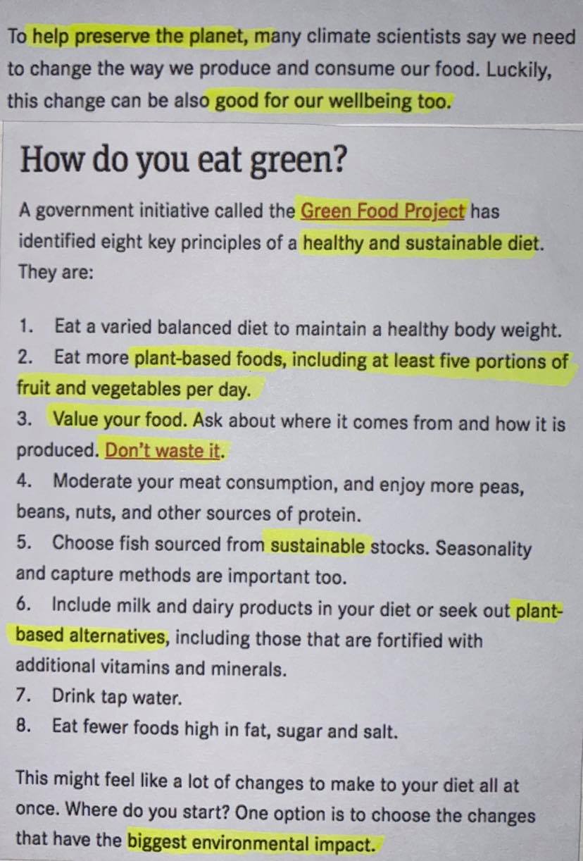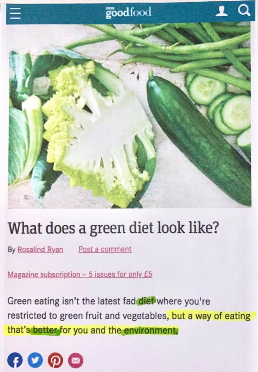 The third article I read was from BBC’s GoodFood website and the article was titled ‘What does a green diet look like?’ This article was also mostly discussing plant based diets, global warming and carbon footprint and interestingly wrote about a ‘government initiative called the Green Food Project’ where the government has identified ‘eight key principles of a healthy and sustainable diet’.