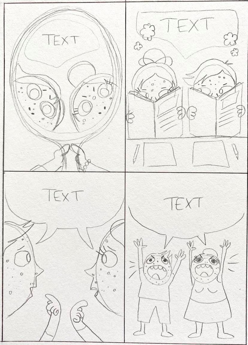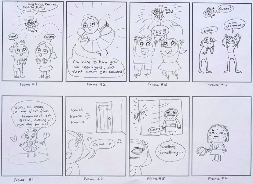 Personally I think that my developmental process for this exercise has been one of the strongest due to the around of research I did on the various children’s illustrations depending on age range. I also think my creative process has been really clear for this exercise as well because of the fact that there are multiple design decisions and changes throughout the process that you can see for instance when I decided to change to look of the ‘puberty’ character in the thumbnail design from overweight with braces to just a simple character with acne. I changed this because as I thought that my illustration strip was just supposed to be focussed around acne it would be irrelevant for the character to be overweight with braces as not all prepubescent kids are overweight with braces!