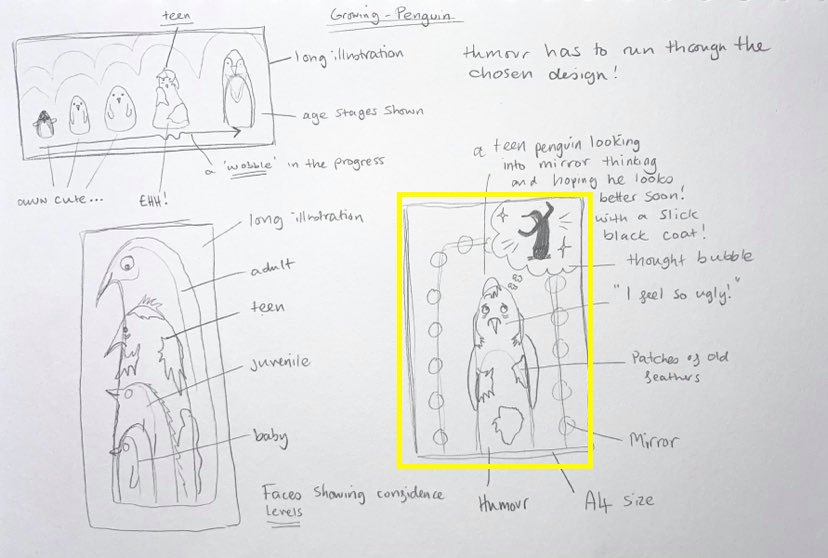 Thumbnail sketches for older age groups (penguin – growing) illustration: