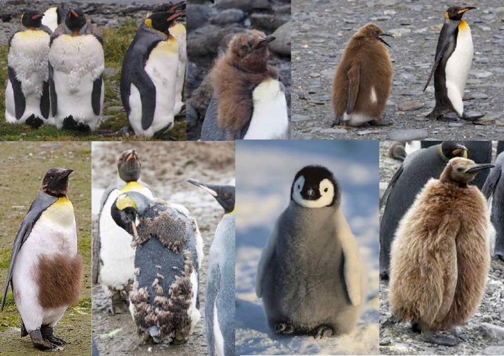 Emperor Penguin (the funny way that emperor penguins go through growth spurts like us humans when they reach puberty). The juvenile penguins go through the same annoying situations like we do, they start of as baby penguins with a very ‘cute’ grey, black and white colour scheme, then they molt again and turn into young penguins with big fluffy brown feathers that make them look sweet but when they eventually start puberty their brown feathers start falling out in order to make room for the adult feathers (yellow, black and white). But they don’t fall out all at once or easily, they slowly come out one by one giving the juvenile a very sad (teenage-like) ‘hairstyle’. Here’s two examples below (poor things!):